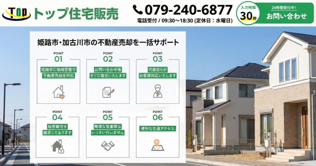 姫路市や加古川市で戸建売却を考えていて、「本当に売れる価格」が知りたい方、安心して売却をお任せしたい方は、ぜひ一度「トップ住宅販売」へお問い合わせください。